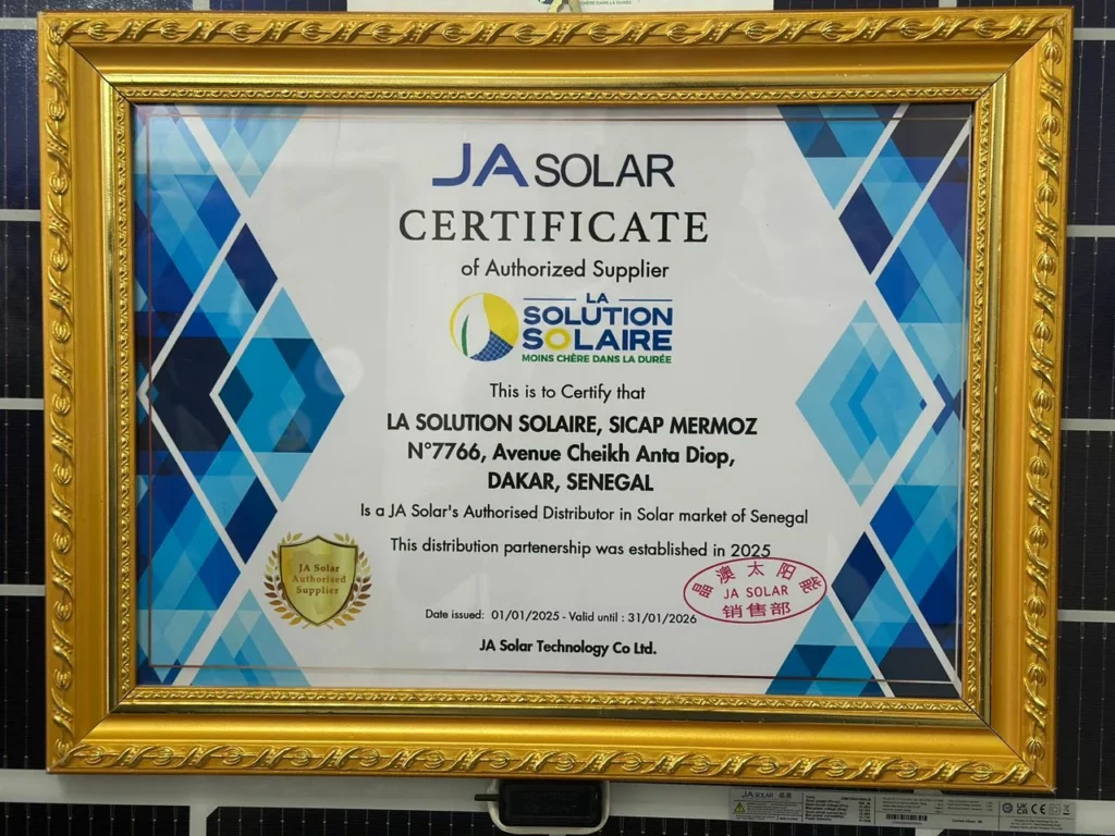 Recevoir ce certificat de JA Solar est pour nous une marque de confiance et une responsabilité. Nous continuerons à œuvrer chaque jour pour proposer des solutions solaires adaptées aux besoins des particuliers, des agriculteurs, des entreprises et des institutions.